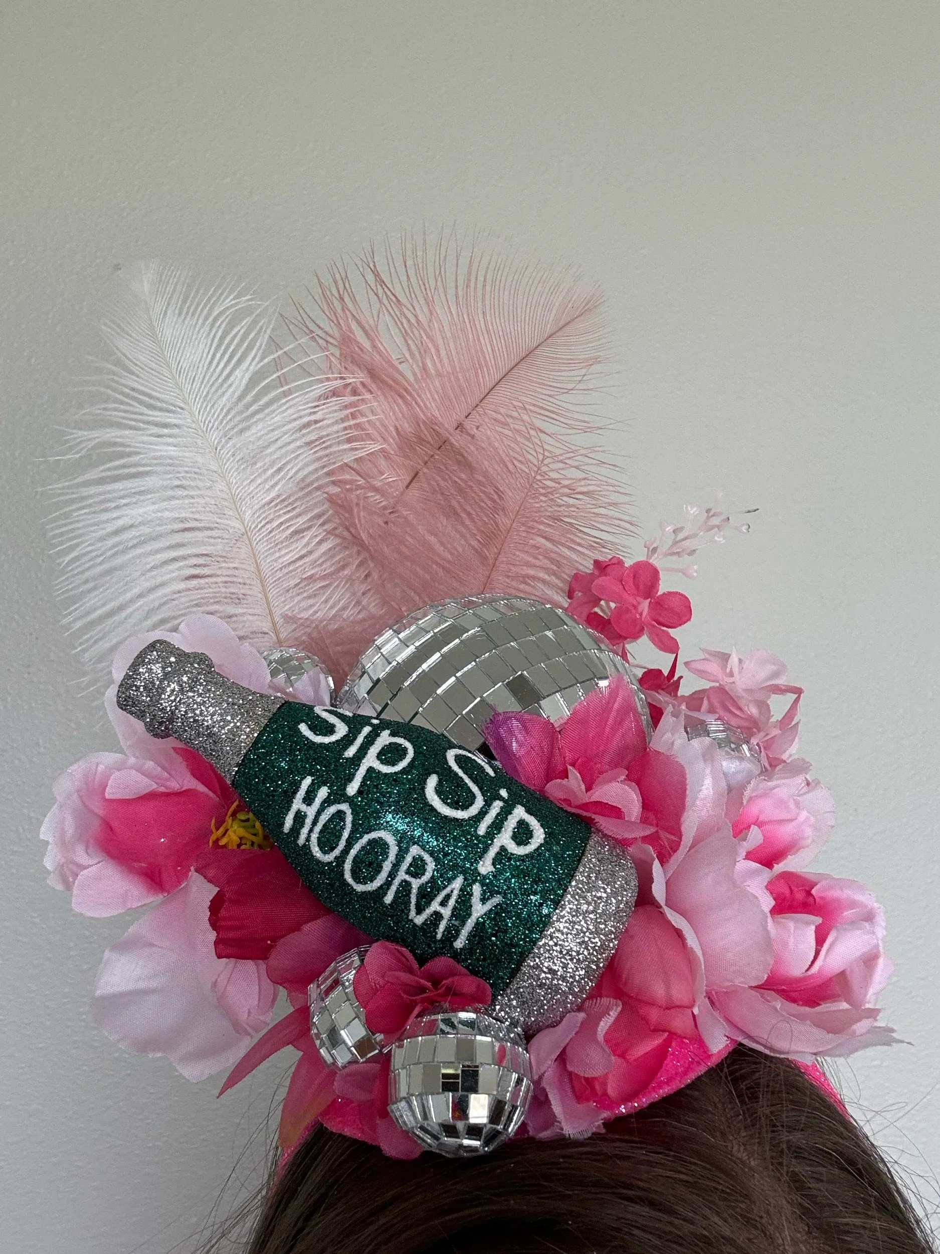 Celebrate in style! This headpiece features pink and silver accents with a champagne bottle that says “Sip Sip Hooray” in glitter, perfect for any momentous occasion.